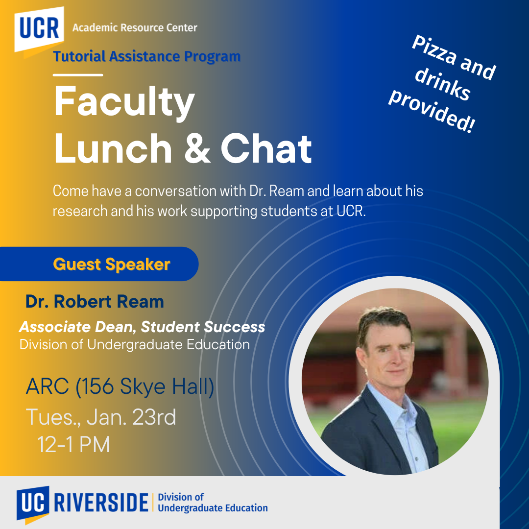 Please see the attached flyer for TAP's (Tutorial Assistance Program at the Academic Resource Center) Faculty Lunch & Chat, next Tuesday, Jan. 23rd from 12-1 pm in the Transfer Success Zone. Our guest speaker is Dr. Bob Ream. Join us to connect with Dr. Ream in a low-key conversation about his research and his work on campus.