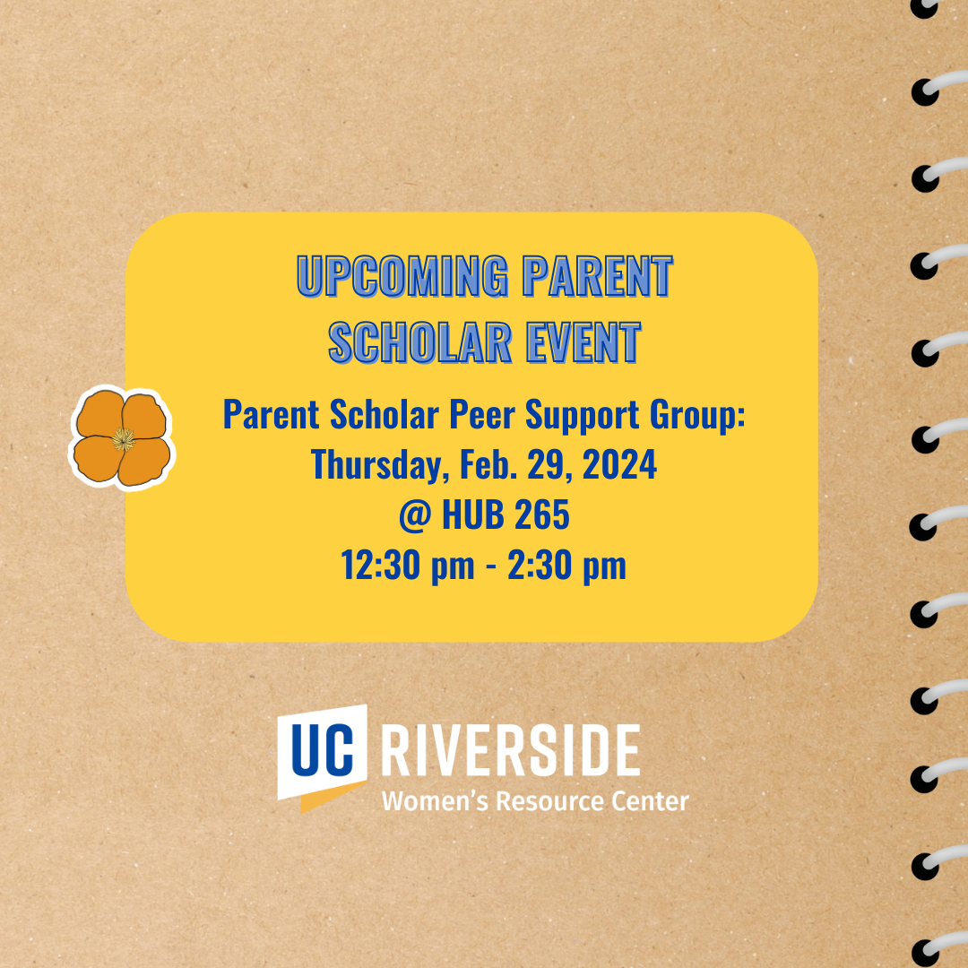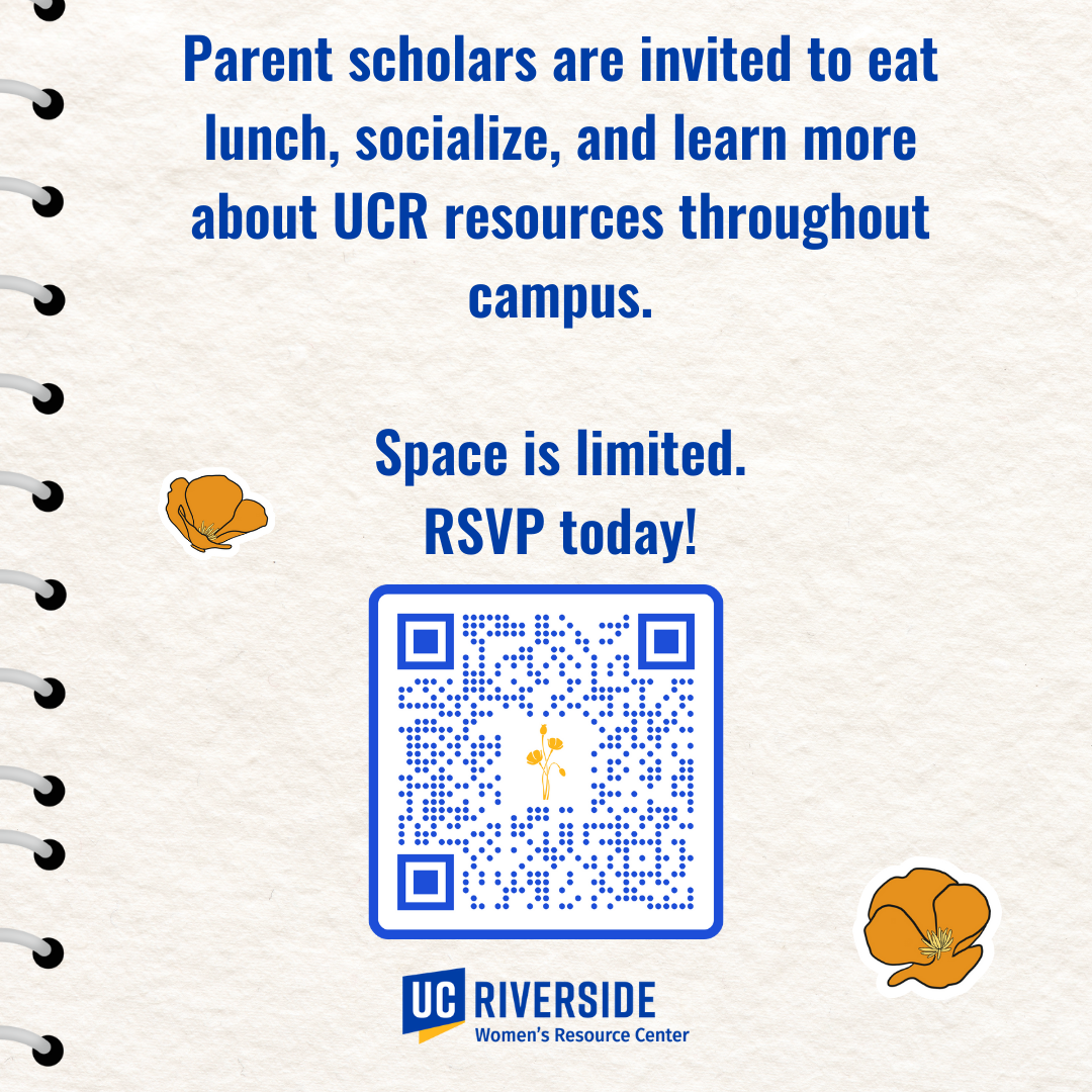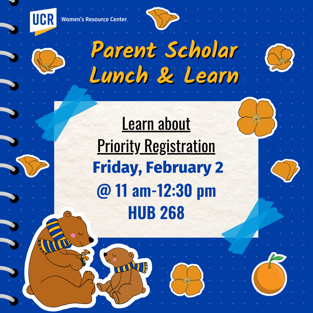 If you're a Parenting Student (you have dependents you care for), please see the upcoming events to learn about resources and support at UCR. The Parent Scholar Lunch & Learn will include the campus registrar, Bracken Dailey!