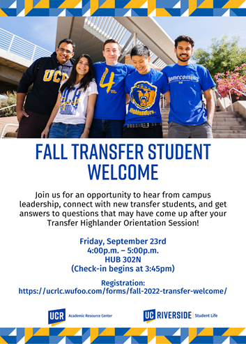 Join the Academic Resource Center and Student Life at the Fall Transfer Student Welcome! Come connect with campus leadership and students. The event is on Friday, September 23rd from 4pm until 5pm in the Highlander Union Building (HUB) 302N.