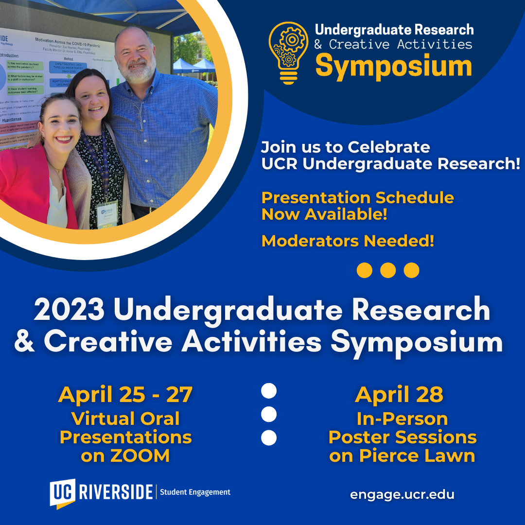 Student Engagement is pleased to announce that the schedule for the 2023 Undergraduate Research and Creative Activity Symposium<https://engage.ucr.edu/symposium/presentation_schedule> is now available. 278 undergraduate researchers will be presenting their faculty-mentored research in disciplines across all colleges.