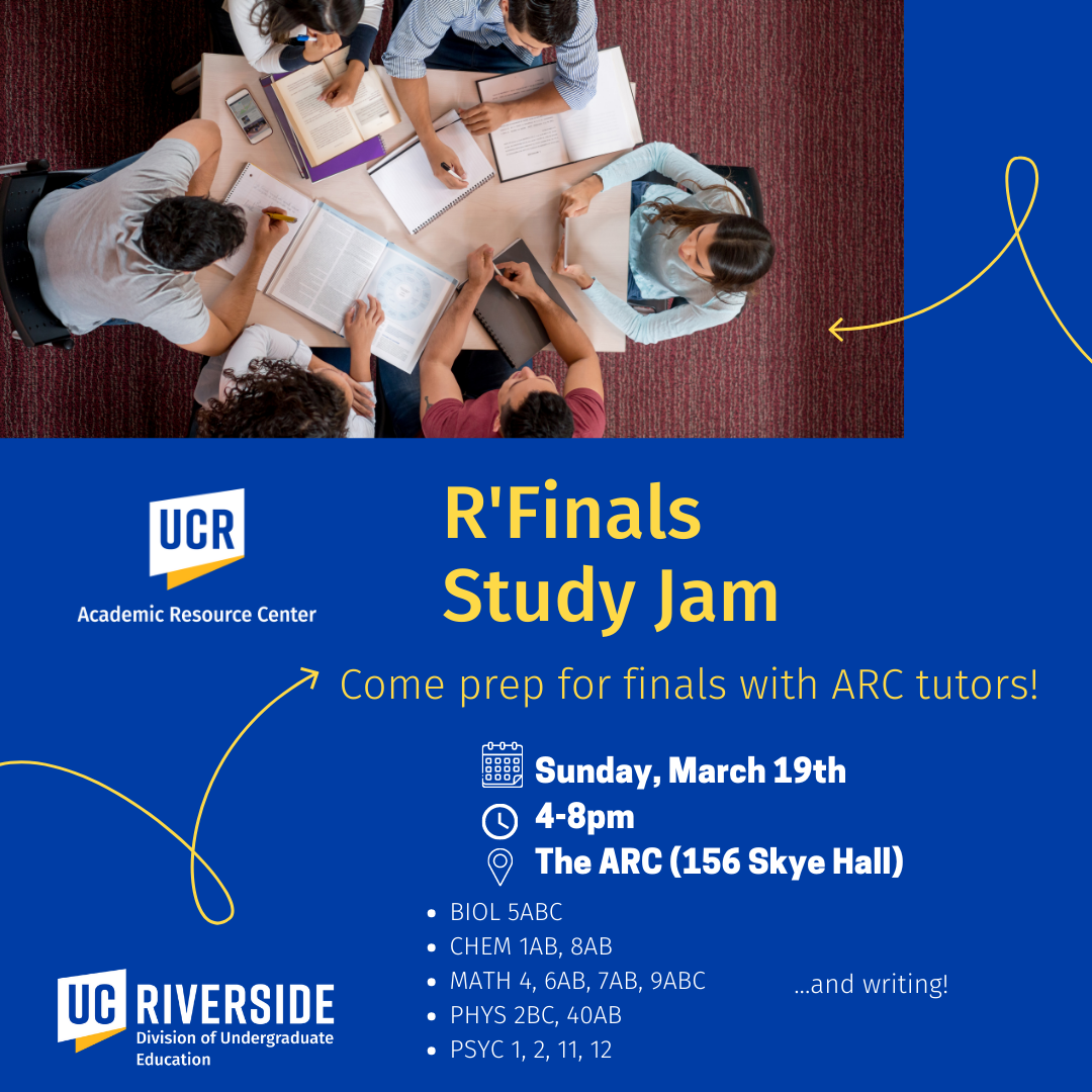 R'Finals Study Jam - On Sunday, March 19th from 4:00pm until 8:00pm, the ARC will be hosing "R'Finals Study Jam"! There will be drop-in tutoring and snacks.