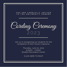 In celebration of your valuable contributions to the Honors community, I would like to cordially invite you to the University Honors Cording Ceremony that is scheduled for June 1, 2023 from 5:00pm- 7:00pm (Check-in begins at 4:30pm) at The Student Recreation Center North (Main Gym). This event celebrates the achievements of our outstanding students, particularly those who have completed an Honors Capstone project. These students will be presented with a lapel pin and their faculty mentors will be asked to cord them with Honors Cords. I hope you will join us for this special event.