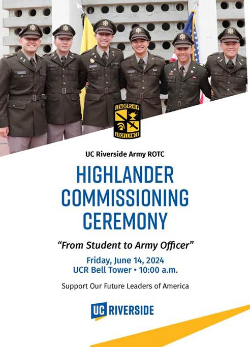 Please join UCR’s Army ROTC tomorrow, June 14 for their annual Commissioning Ceremony. The ceremony will be held at the Bell Tower beginning at 10 a.m.