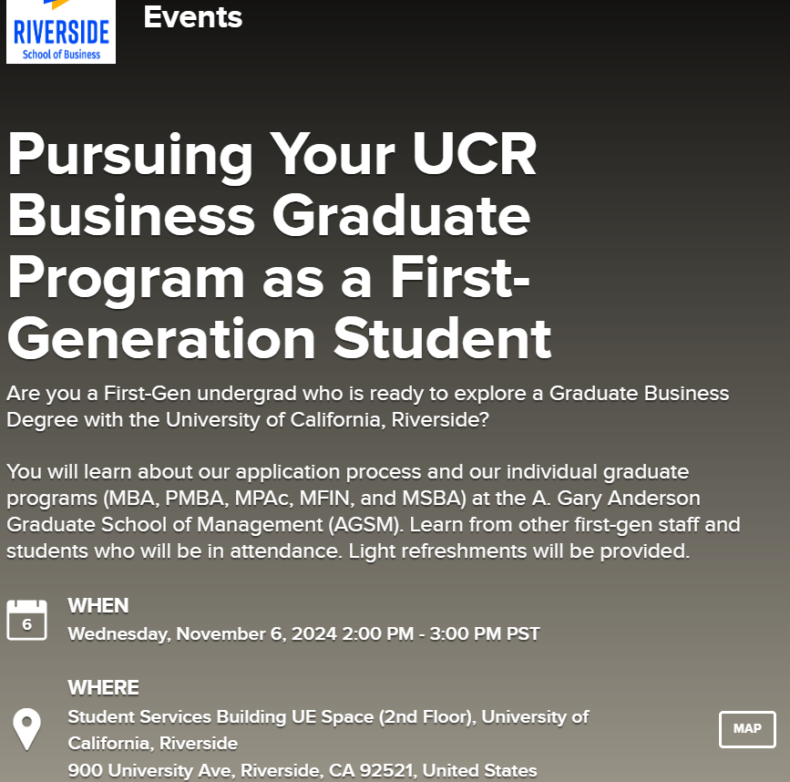First Gen week is almost here! Please share with your students these awesome 5 events! This includes two art nights, business grad school session, first gen health care profession panel and a lunch! All through Nov. 4-8 and taking place in the SSB 2nd floor. Flyers attached and event information can be viewed here<https://events.ucr.edu/group/first_generation>. Remember to show your support with changing your zoom backgrounds. We have created some great ones on our site<https://firstgen.ucr.edu/>, just scroll down. Have a great day!