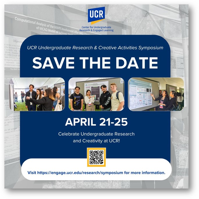 The annual Undergraduate Research & Creative Activities symposium<https://engage.ucr.edu/research/symposium> at UC Riverside showcases the project outcomes of talented UCR students, who learn beyond the classroom. This event highlights the culmination of their experiences in research, creative activities, internships, and interdisciplinary projects that have an economic, scientific, and social impact on our increasingly interconnected world. UCR students are explorers, activists, leaders, and entrepreneurs. Please join us in celebrating their contributions on campus and beyond!