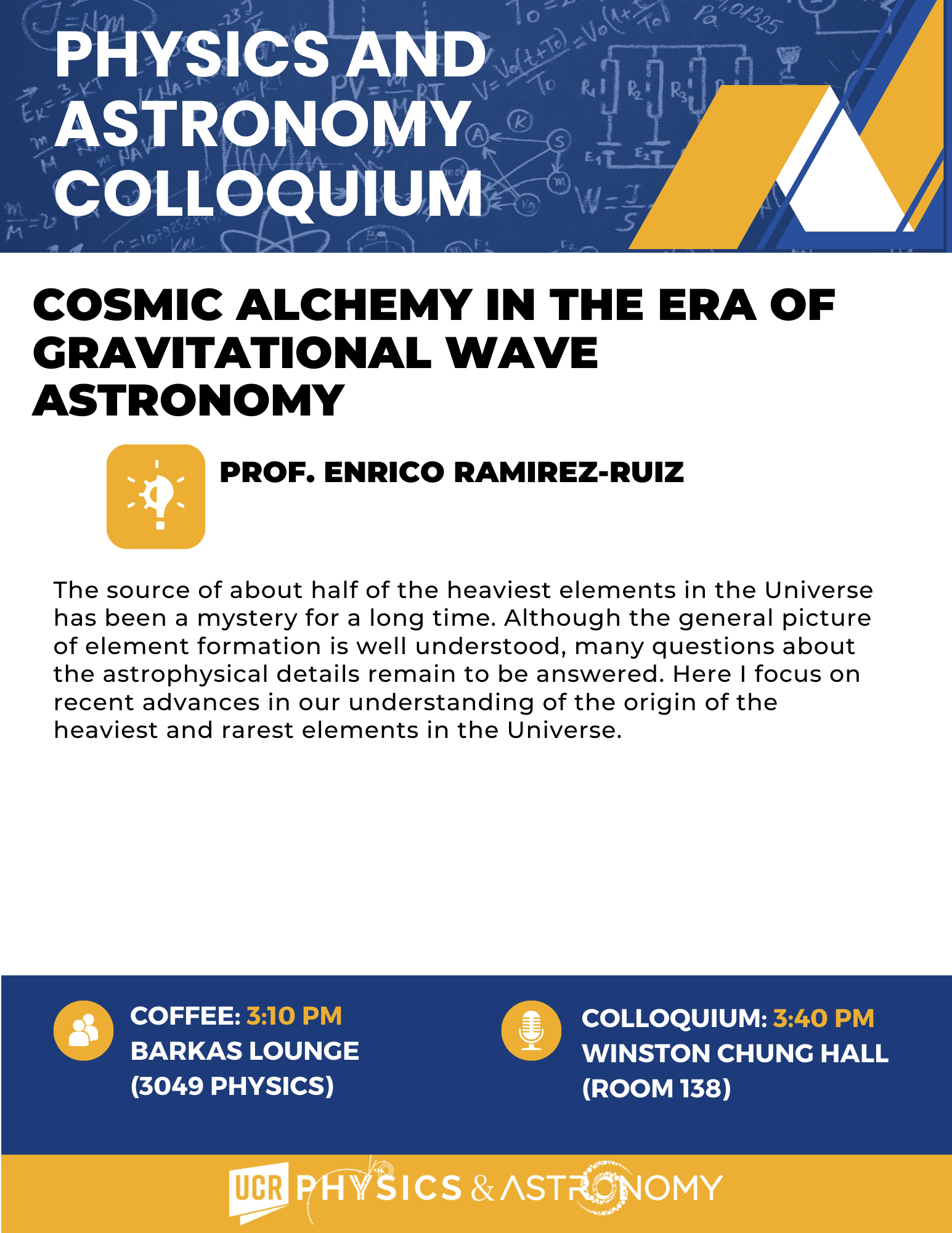 Our weekly colloquium is happening this Thursday with guest speaker, Dr. Enrico Ramirez-Ruiz.