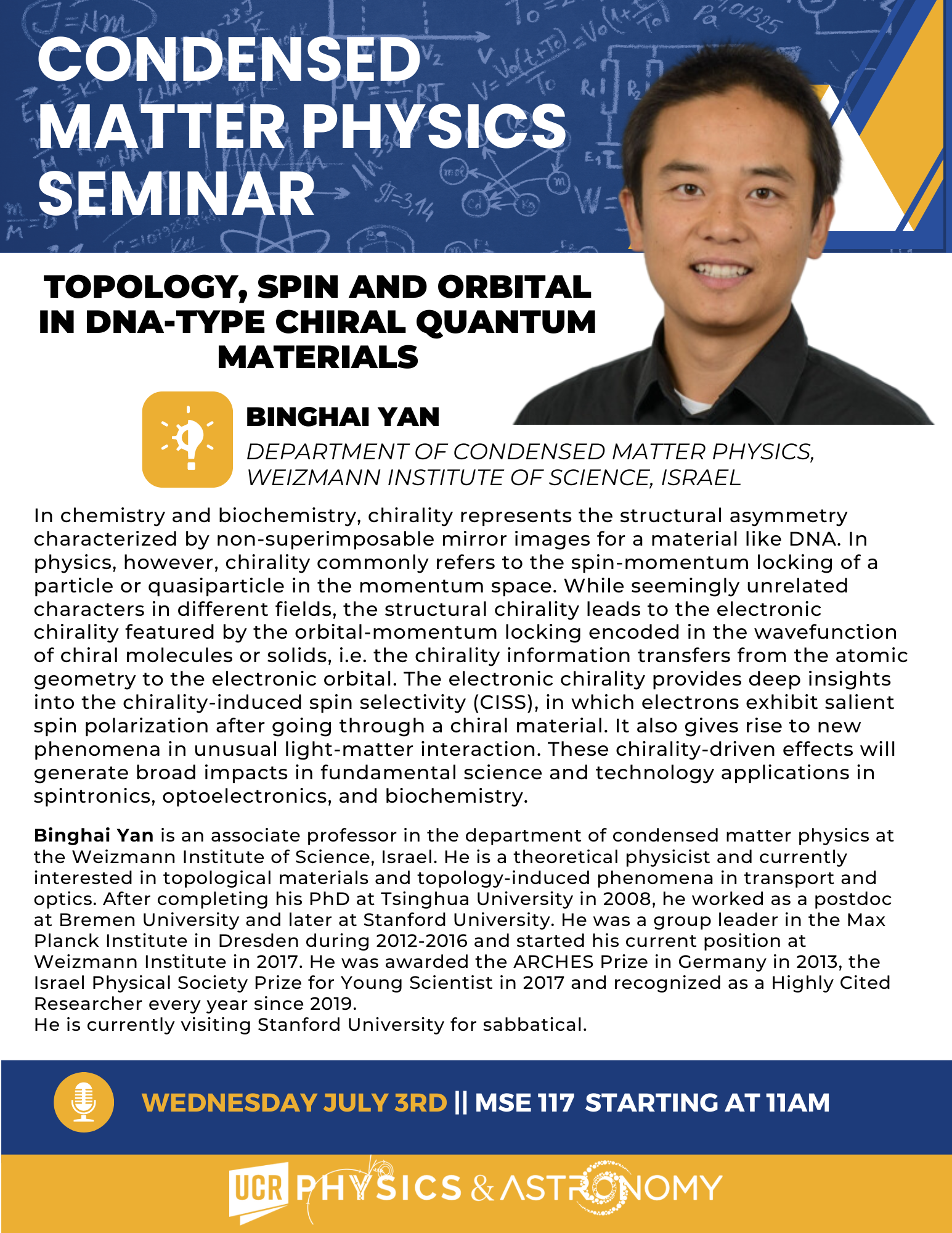 We are pleased to invite you to our condensed matter physics seminar on July 3rd with Prof. Binghai Yan.
