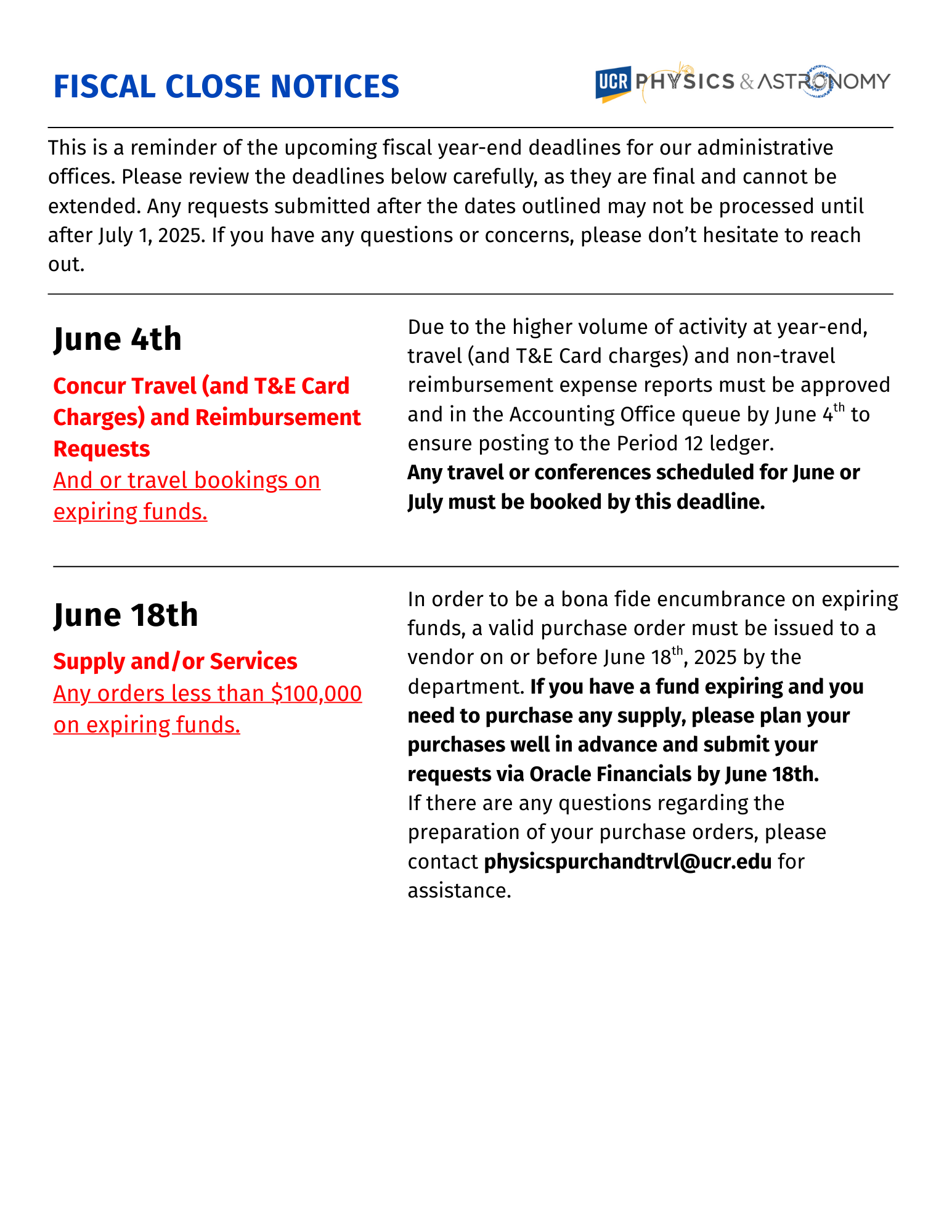 [Physics-talks] Fiscal Closing Deadlines | Purchasing & Travel