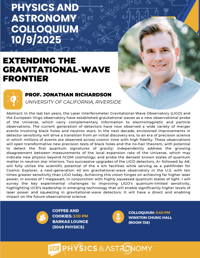 [Physics-talks] TODAY! 10/09/2025 Colloquium - Prof. Jonathan Richardson from University of California, Riverside!