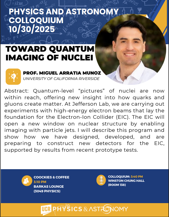 [Physics-talks] TOMORROW 10/30/2025 Colloquium- Prof. Miguel Arratia Munoz from University of California, Riverside