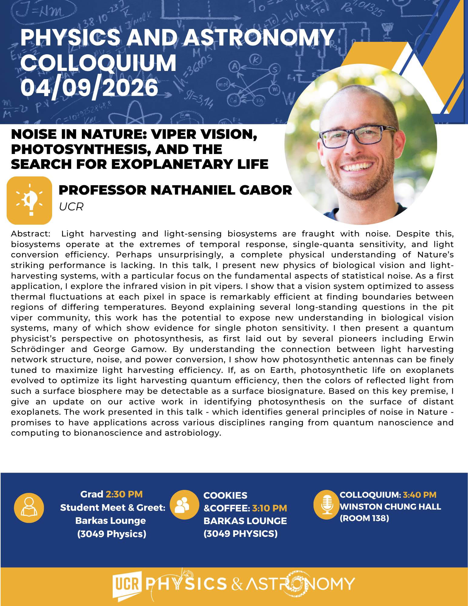 [Physics-talks] COLLOQUIUM THURSDAY 04/09/2026 – Don't Miss Dr. Nathaniel Gabor from UCR!