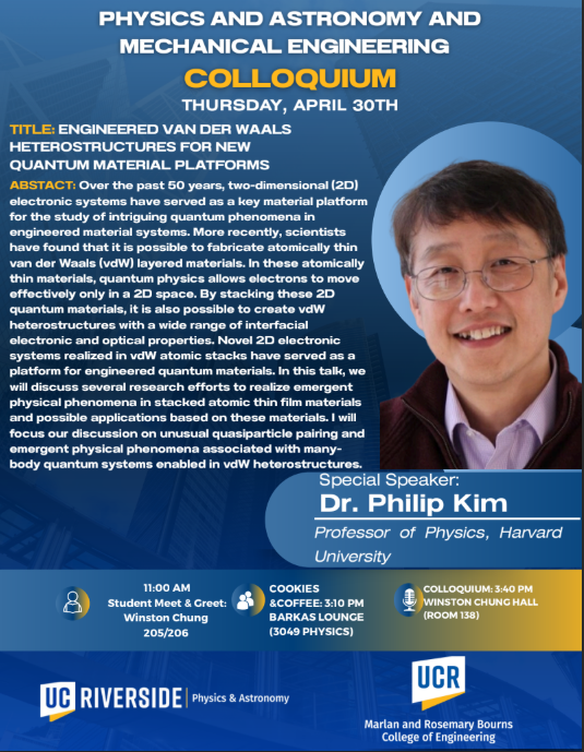[Physics-talks] COLLOQUIUM THURSDAY 04/30/2026 – Don't Miss Dr. Philip Kim from Harvard!