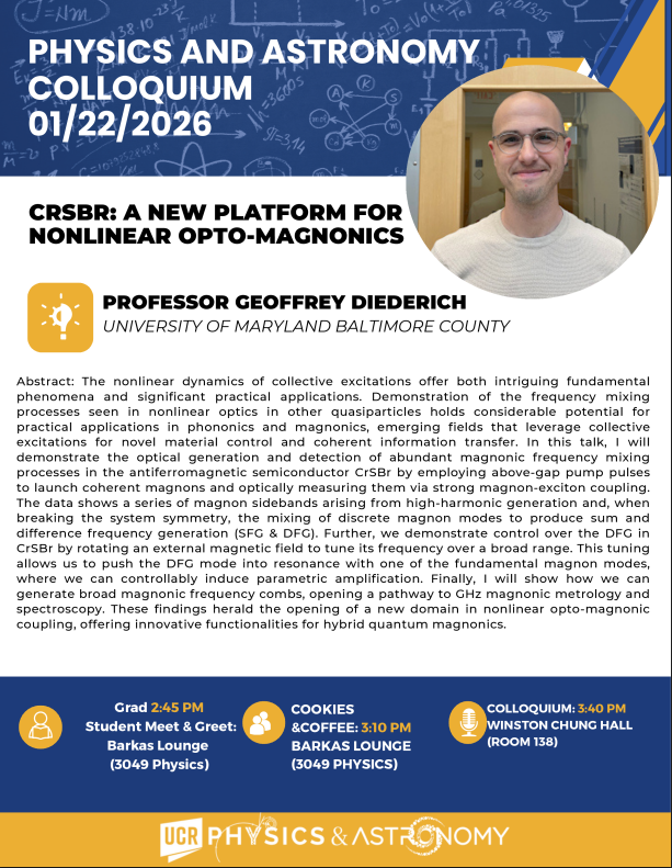 [Physics-talks] TODAY 01/22/2026 Colloquium – Professor Geoffrey Diederich from University of Maryland Baltimore County
