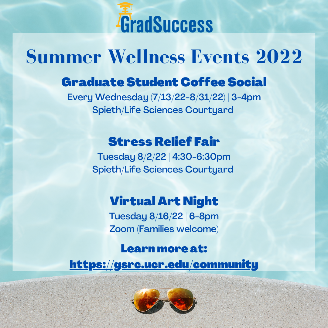 * On campus this summer and wanting to connect with community<https://gsrc.ucr.edu/community>? Come by our weekly Wednesday afternoon coffee socials (3-4pm in Spieth Courtyard) or the Stress Relief Fair (August 2nd, 4:30-6:30pm in Spieth Courtyard) for free food/drink and good company, or log on to our Virtual Art Night on August 16th, 6-8pm, for a relaxing drawing lesson.
