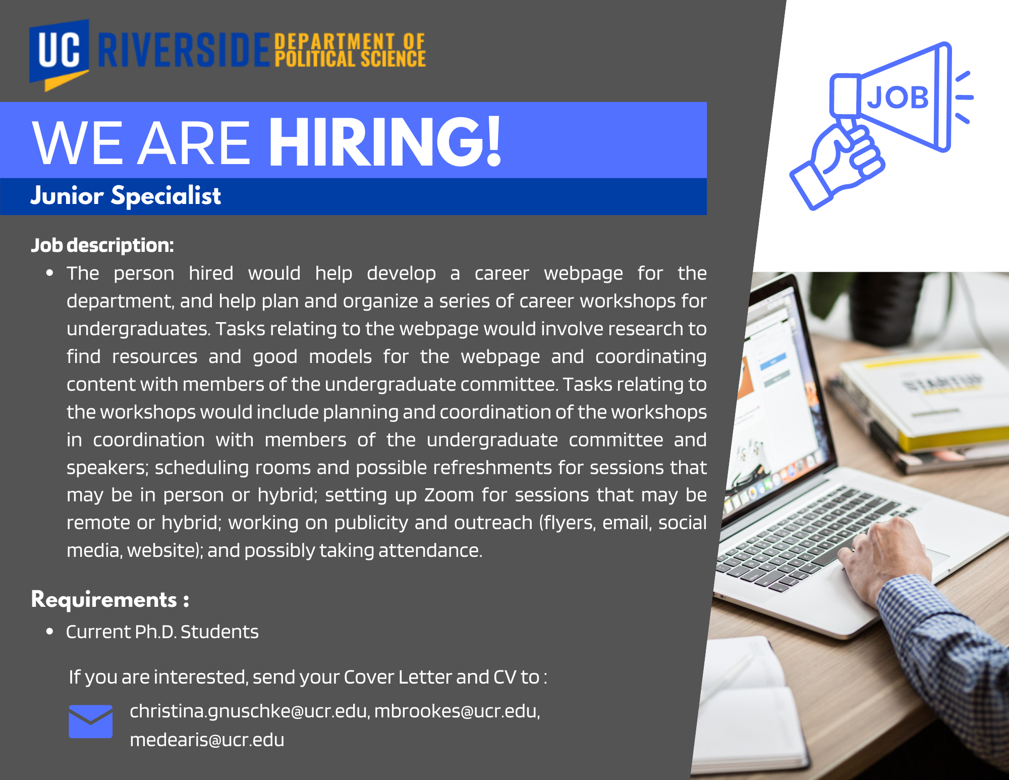 The Department of Political Science is hiring a Junior Specialist. Please see the below job description and reply to this email with your cover letter and CV copying myself, Marissa Brookes and John Medearis by Wednesday, August 3rd.