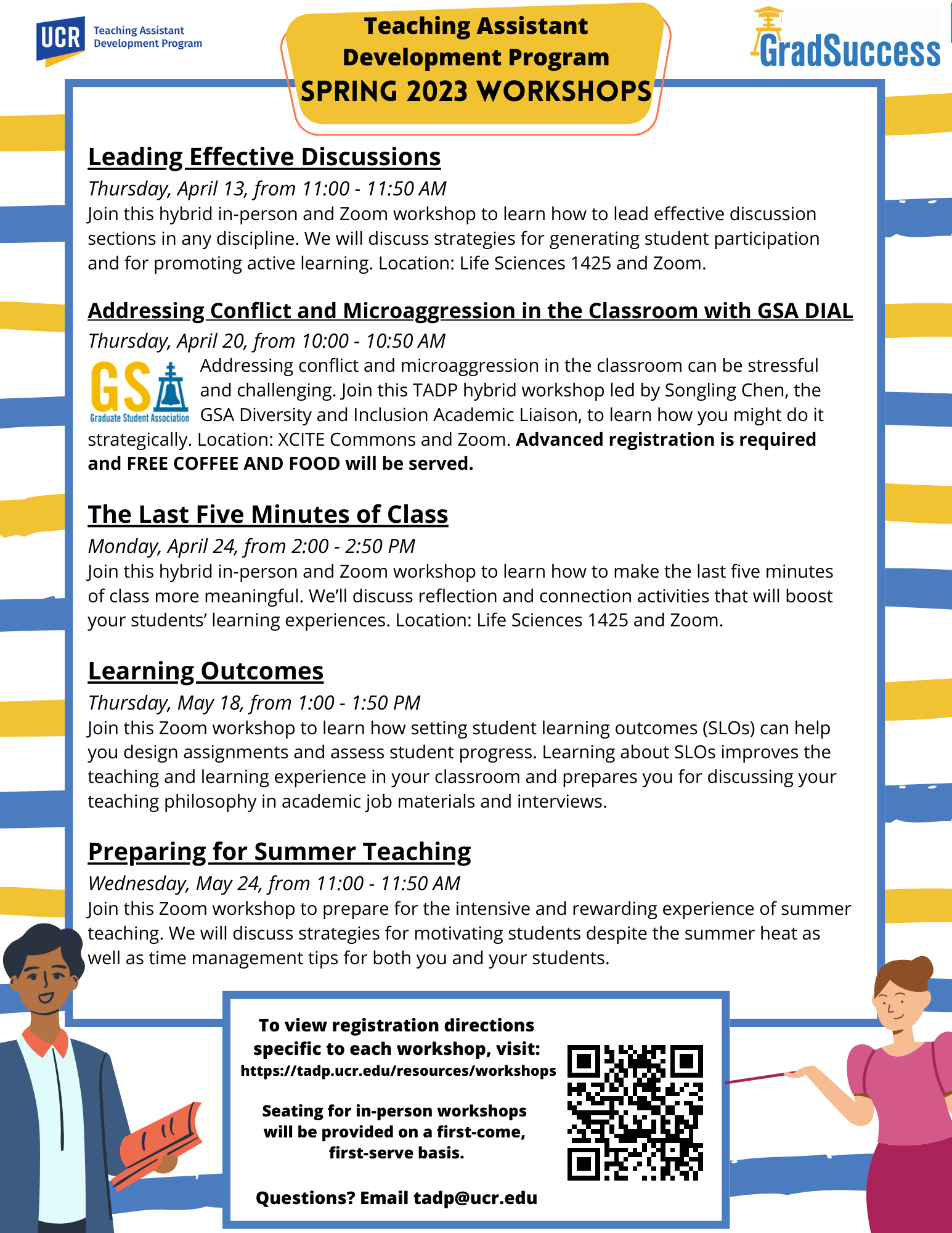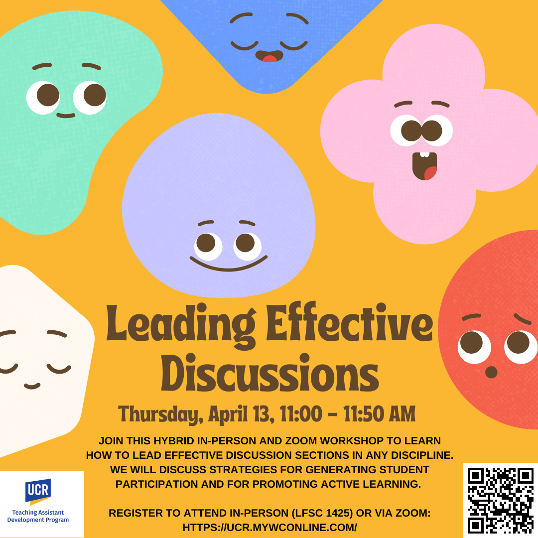 * Leading Effective Discussions, Thursday, April 13th, 11-11:50AM, LFSC 1425 and Zoom<https://ucr.zoom.us/j/96479253358> (see flyer).