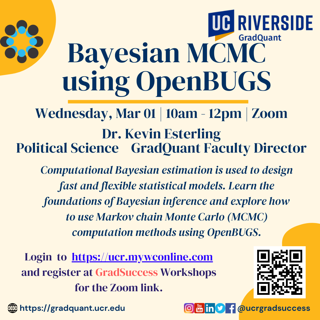 Computational Bayesian estimation is used to design fast and flexible statistical models. Learn the foundations of Bayesian inference and explore how to use Markov chain Monte Carlo (MCMC) computation methods using OpenBUGS with Dr. Esterling, who is also the Faculty Director of GradQuant.
