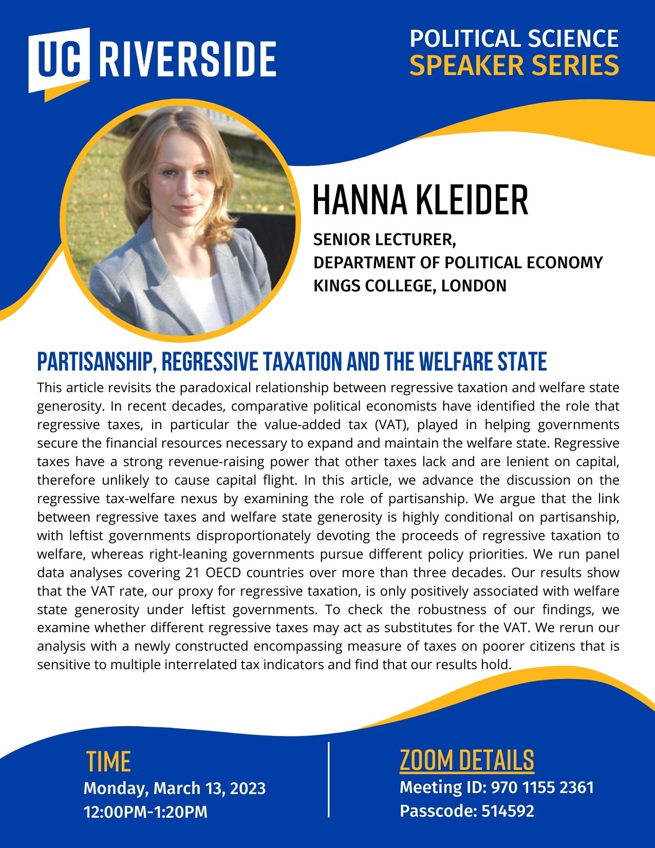 Dr. Kleider will be discussing "Partisanship, Regressive Taxation and the Welfare State" via Zoom<https://ucr.zoom.us/j/97011552361?pwd=c2p4VHVHU0tRSVhRZy9ZdFhnVnl3QT09> on Monday, March 13th, 2013 at 12-1:20pm PST.