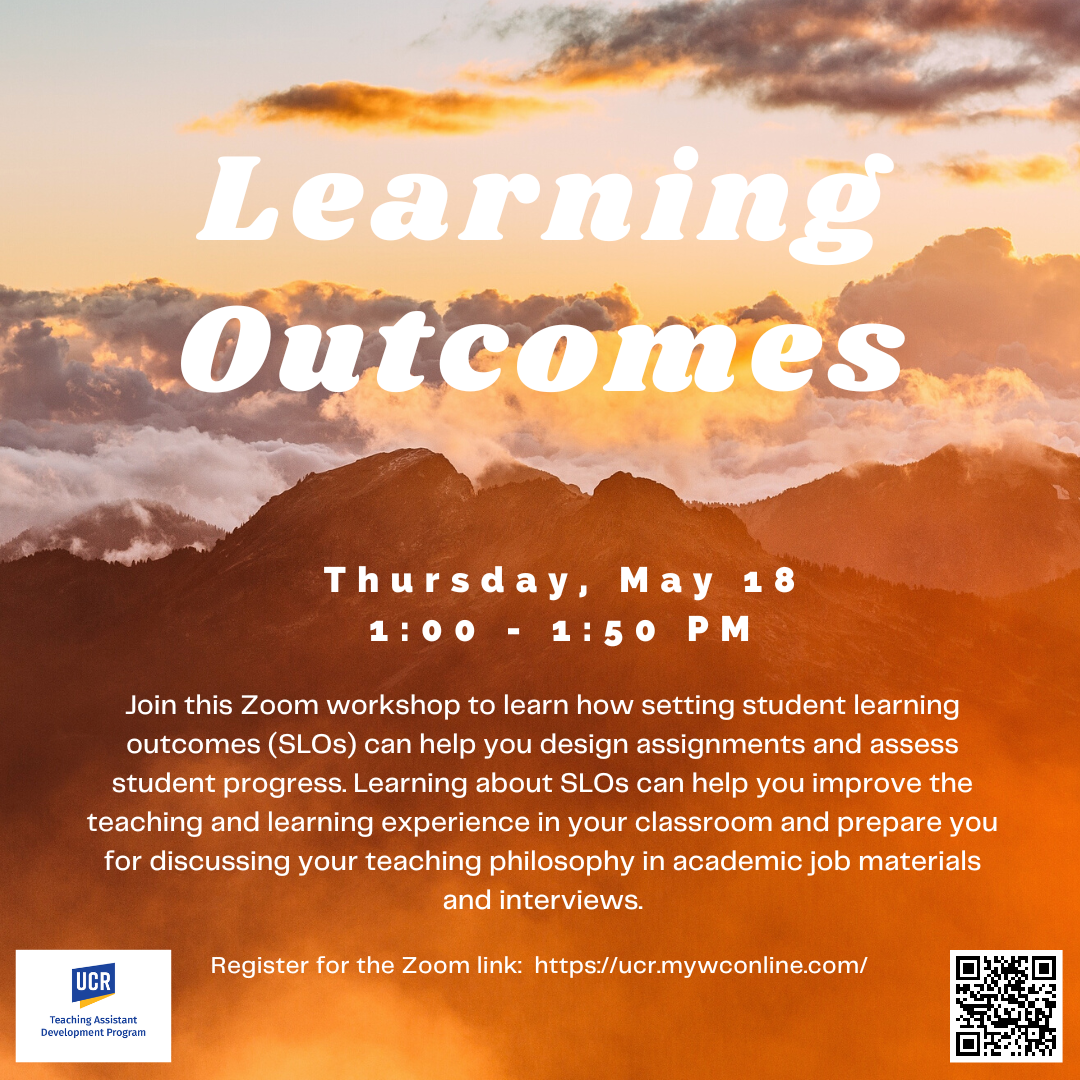 * Learning Outcomes, Thursday, May 18th, 1-1:50PM, Zoom<https://tadp.ucr.edu/resources/workshops>.