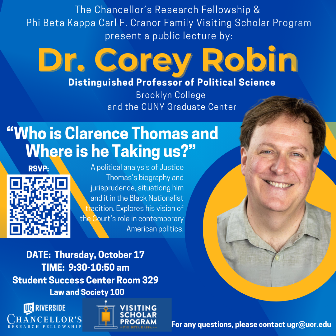 Prof. Cory Robin will be visiting UCR on October 17-18th, at the invitation