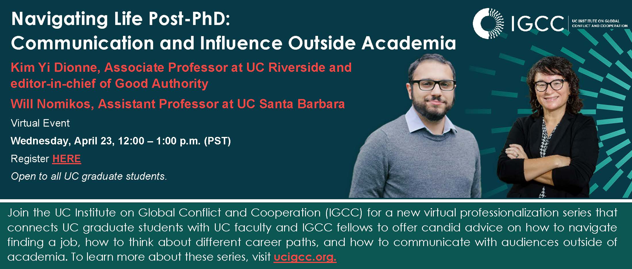 Could you share the following opportunity with your graduate students? We’d love for them to participate. They can register HERE<https://ucigcc.org/events/navigating-life-post-phd-communicating-with-non-academic-audiences/>.