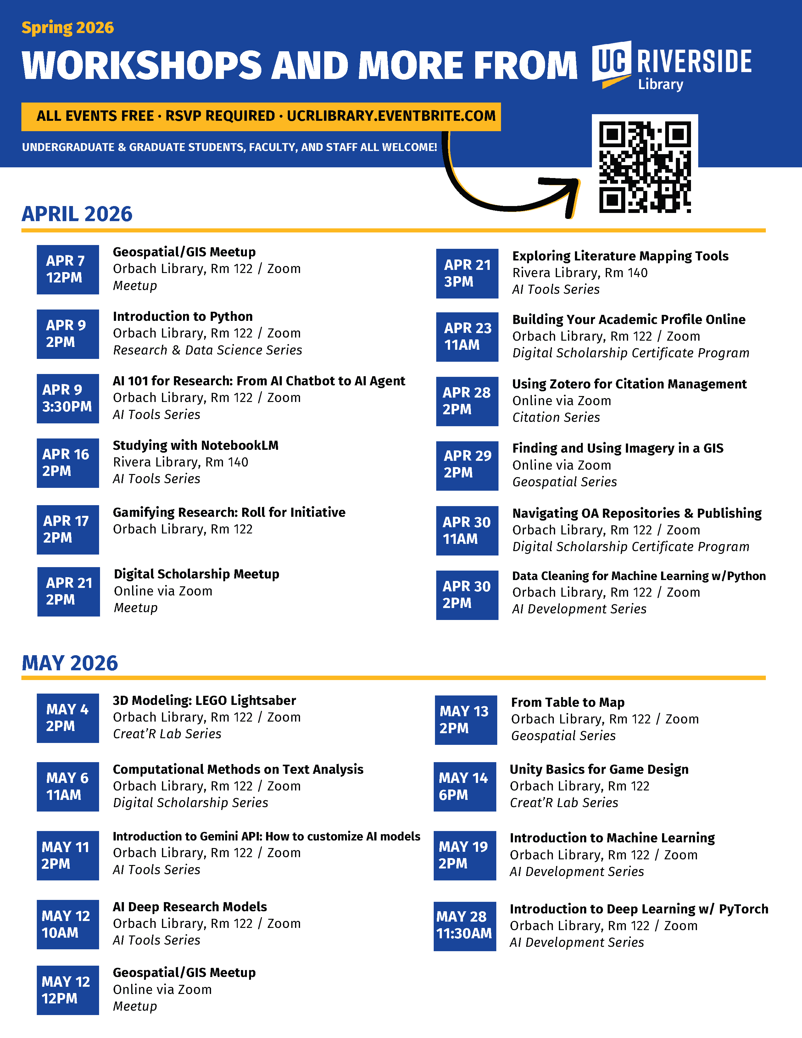 The UCR Library has scheduled workshops for the Spring 2026 Quarter. Please