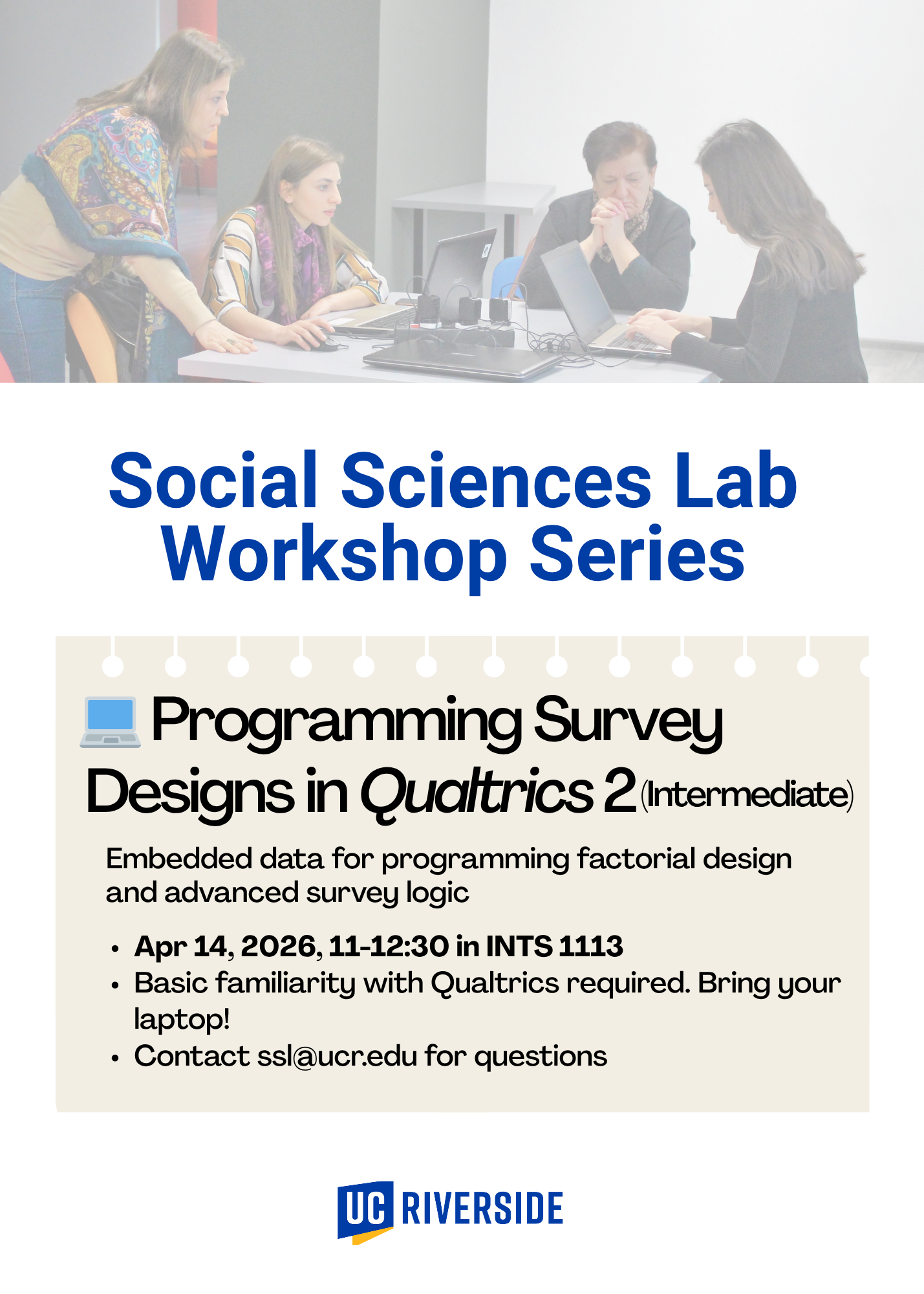 The Social Sciences Lab holds a Qualtrics workshop on *Tuesday, April 14,