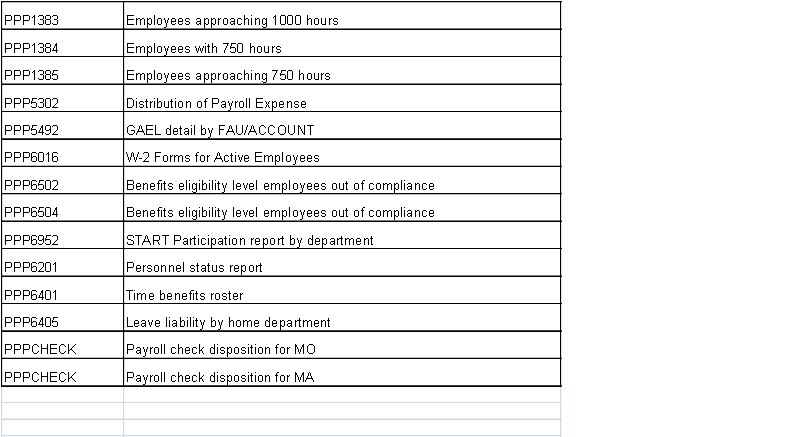 At the March PPS Users' group meeting, Gabe Nwandu with the assistance of Terri McDonald (C&C) and Veronica Ruiz (AVC-Enrollment) conducted a demo of the new iReport web application. The Payroll and Human Resources offices will discontinue printing and mailing PPS paper reports to departments. C&C is currently migrating the reports and many are now available. When completed, the following reports will be available on iReport. From now on, please logon to iReport to retrieve, view and print these reports as needed. For access to iReport application, please contact your departmental SAA.