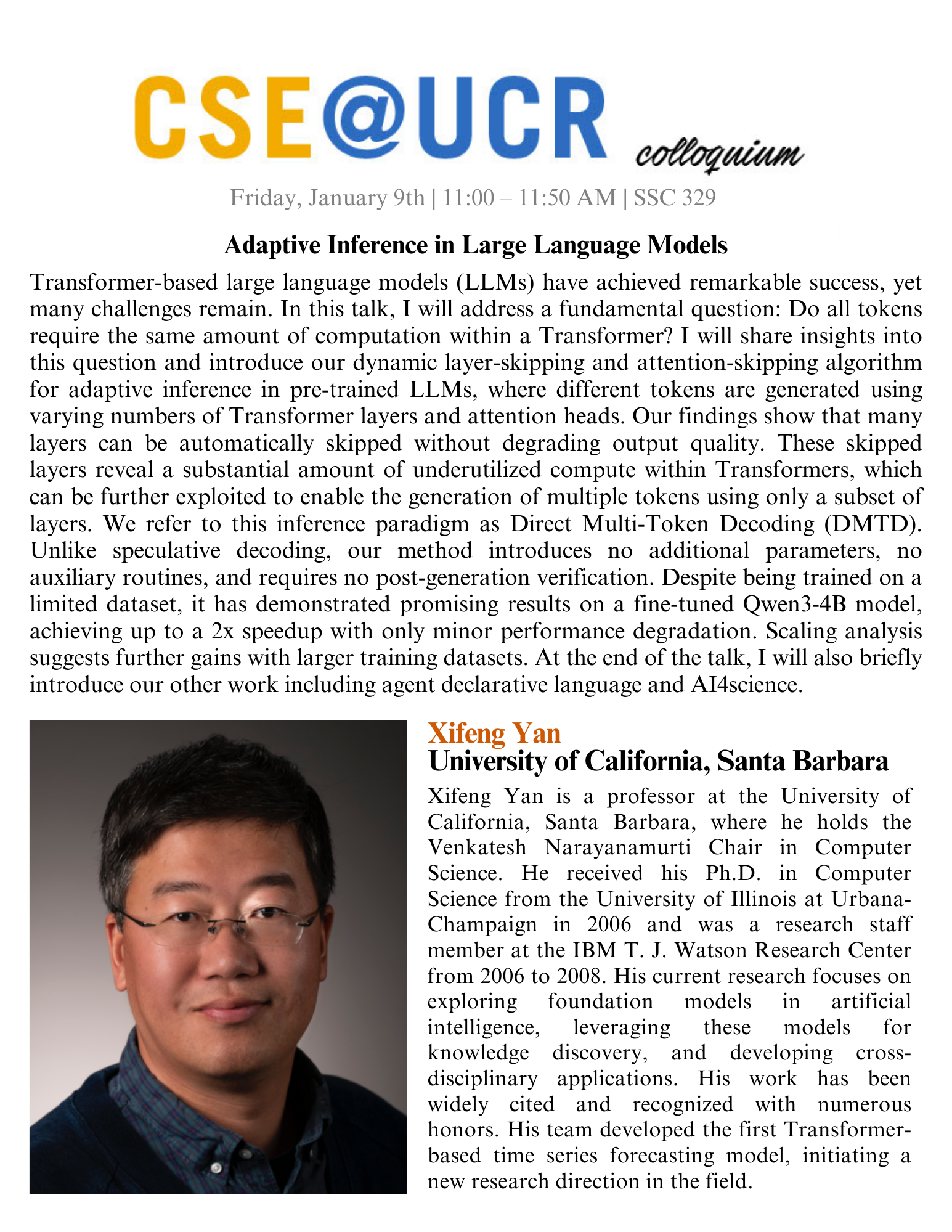 Subject: [CSE Faculty List] Colloquium 01.09.2026 - Xifeng Yan
