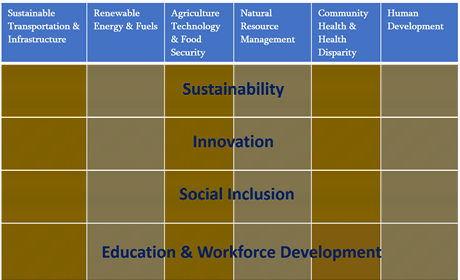 In terms of programmatic activities, OASIS is supported by six pillars in broad areas of transportation, energy, agricultural, natural resources, health, and human development, which are weaved across by the horizontal OASIS goals of Sustainability, Innovation, and Social Inclusion and the university mission in Education and Workforce Development, as represented in the matrix below.