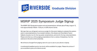 > We are soliciting judges for the 2025 Graduate Division MSRIP <https://apro.ucr.edu/undergrad/msrip> Symposium on Friday, August 15th at the Alumni Center. Our UG scholars will be competing for the Maria Franco Gallardo awards for best poster and oral presentations. Research topics will range from the arts and humanities, social sciences and stem fields. Our students will be tailoring their presentations for a general audience so no special expertise is needed to judge. Please complete the form below if you can join us.