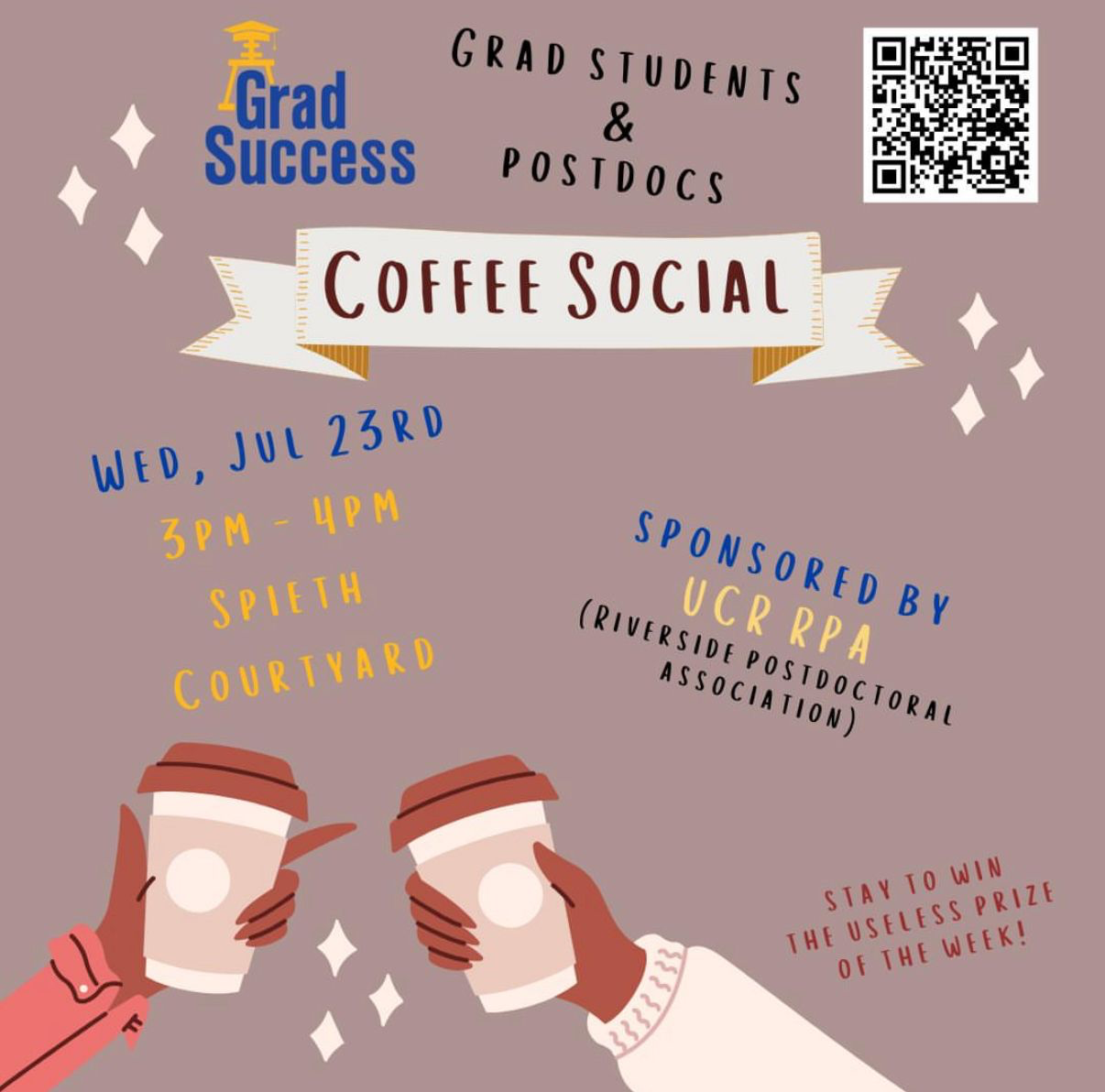 We want to remind you to join us at the Grad Success & Postdocs Coffee Social that will take place in the Spieth Courtyard on Wednesday, Jul 23rd, from 3-4 pm.