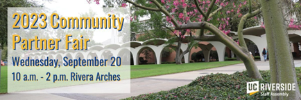 Please join us on Wednesday, September 20, from 10 am -2 pm in front of the Tomás Rivera Library for our Staff Assembly Community Partner Fair!