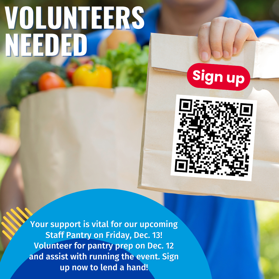 We invite you to make a difference by volunteering during our upcoming Staff Pantry! Choose a time slot that fits your schedule. We have 6 spots available for set-up on Thursday, December 12, from 2:00 - 3:00 pm. On Friday, December 13, you can help with set-up from 10:00 am - 12:15 pm, with 3 spots open. Additionally, there are 5 openings for distribution on Friday, December 13, from 12:15 - 2:45 pm. Sign up now to lend a hand - https://www.signupgenius.com/go/60B044FAFA72BABF94-53495250-staff#/