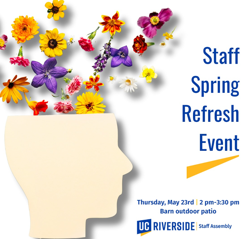 Just a reminder that Staff Assembly is hosting our Staff Spring Refresh<https://events.ucr.edu/event/staff-spring-refresh> event this afternoon at the Barn Patio from 2:00pm-3:30pm! Please come join your Staff Assembly Board for a sweet treat, wellness booths, crafts, and games! In honor of Mental Health Awareness Month, take a break from the hustle and bustle and unwind for a bit with us today!