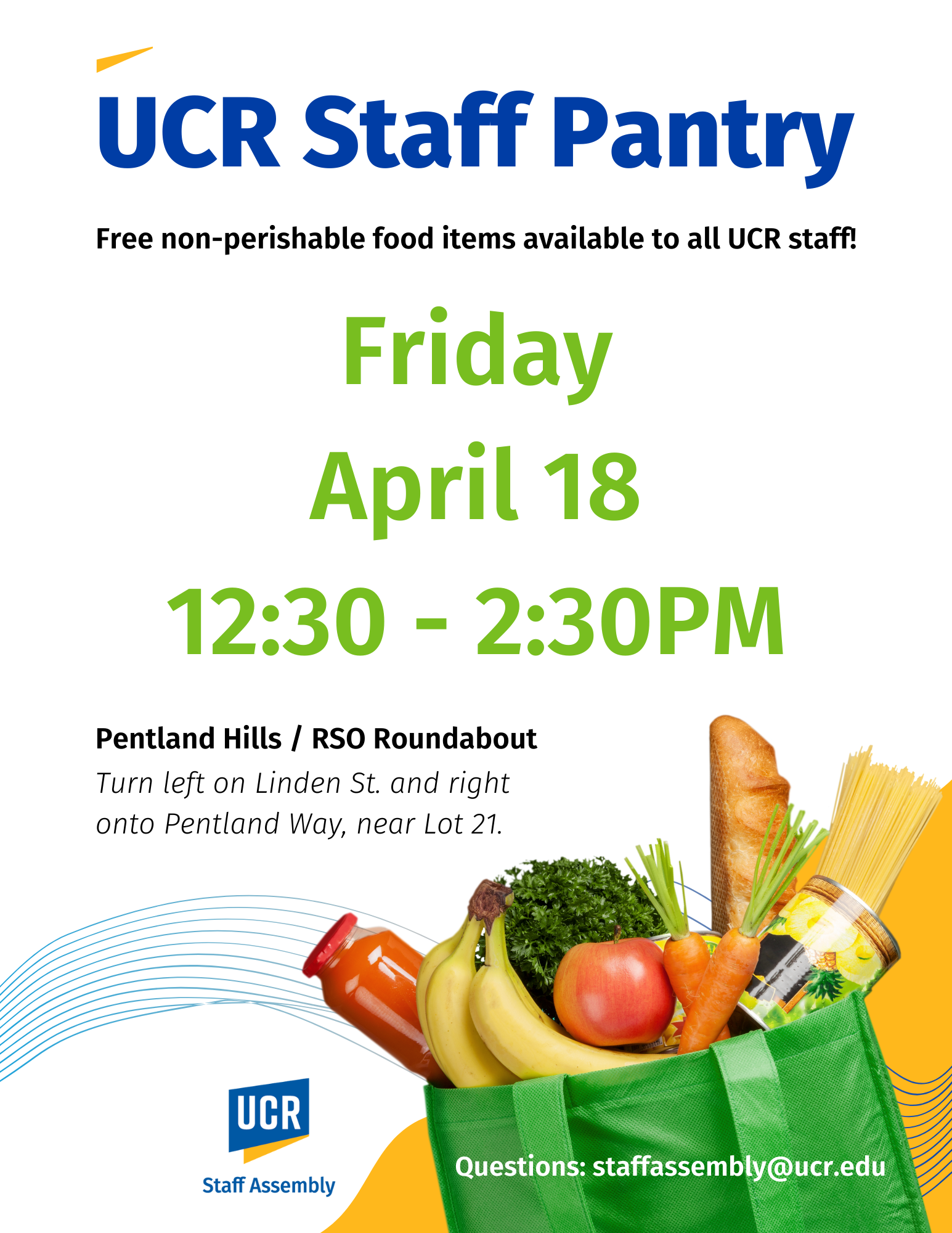 Please join us for our upcoming Staff Pantry on Friday, April 18, from 12:30 PM to 2:30 PM near the Pentland Hills/RSO Roundabout! Hurry, items will be served on a first-come, first-served basis.