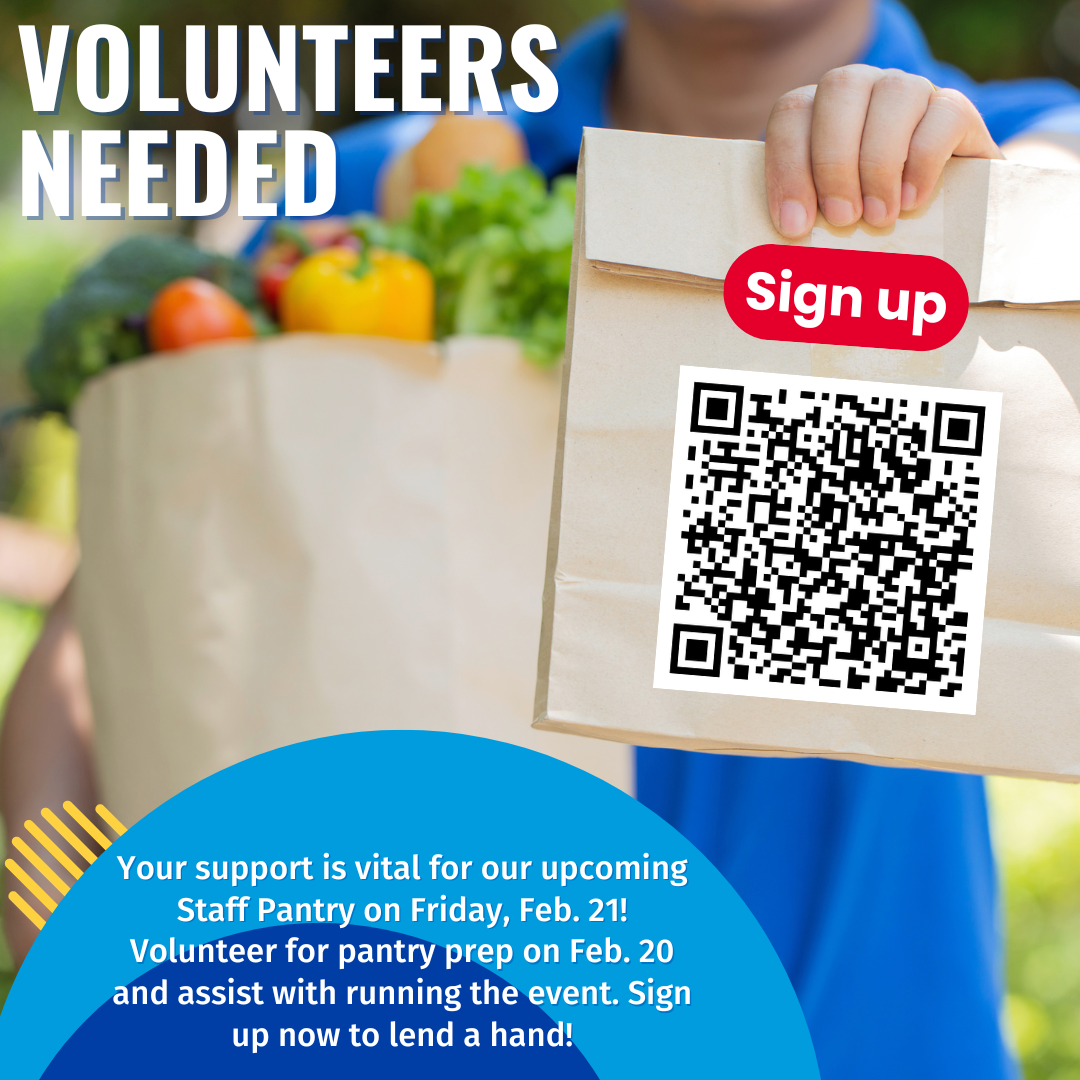 If you would like to volunteer, please select the time slot that works best for you. Sign up now to lend a hand, we have two spots open today from 2 - 3pm, and two spots open on Friday 2/21 from 12:15 - 2:45pm.