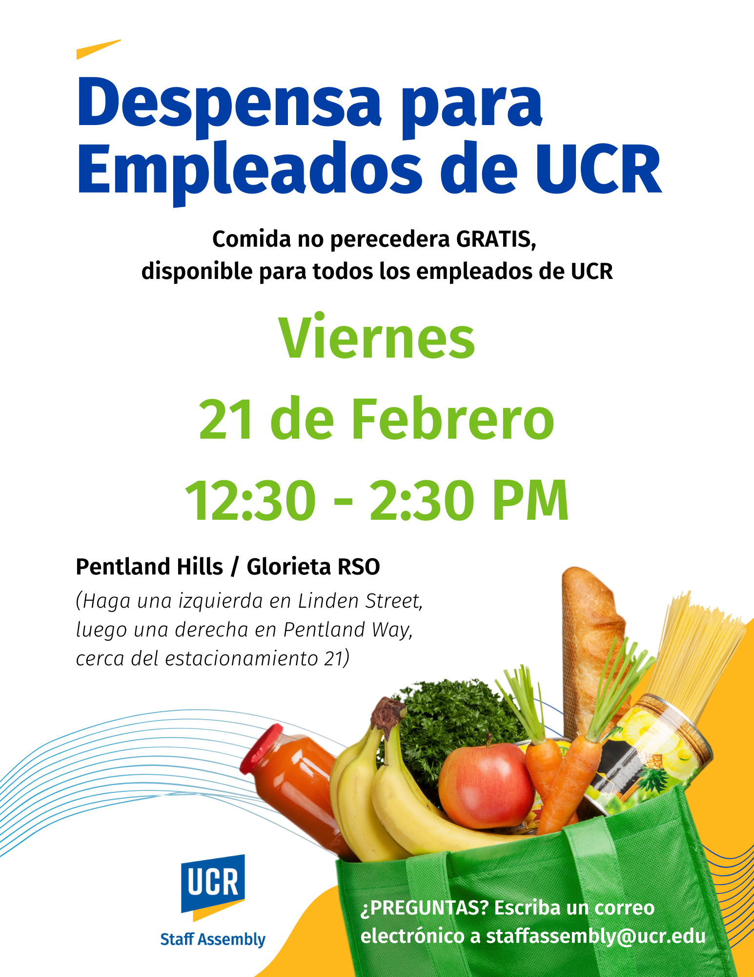 Please join us for our upcoming Staff Pantry on Friday, February 21, from 12:30 PM to 2:30 PM near the Pentland Hills/RSO Roundabout! Hurry, items will be served on a first-come, first-served basis.