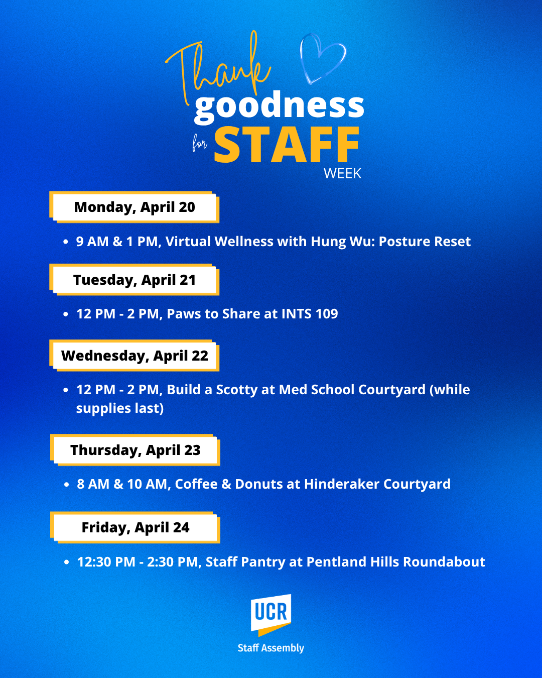<https://events.ucr.edu/event/thank-goodness-for-staff-week-550?utm_campaign=widget&utm_medium=widget&utm_source=UC+Riverside&_gl=1*75srny*_ga*MTAyNDUwNDk2Mi4xNzcwMjM4Mjk4*_ga_S8BZQKWST2*czE3NzU4NTE3MDYkbzk4JGcxJHQxNzc1ODU2NzMzJGo1NyRsMCRoMA..*_gcl_aw*R0NMLjE3NzQ0NjY0NzYuQ2owS0NRandqNDdPQmhDbUFSSXNBRjV3VUVHZFd2Wk13LWU1RG41blZfMmNRMGhaaTJMYkVZdm8xREV0R0JWN21TZnNkSUx0ZEl0WXdhOGFBckFLRUFMd193Y0I.*_gcl_au*OTc0NjkxMDUzLjE3NzAzMjE3ODA.*_ga_Z1RGSBHBF7*czE3NzU4NTE3MDckbzk3JGcxJHQxNzc1ODU2NzMzJGo1NyRsMCRoMA..>,