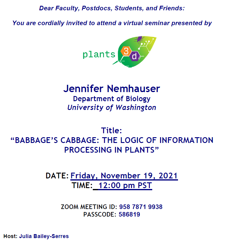 [Seminarcontacts] Plants3D Seminar: Jennifer Nemhauser - Friday, November 19, 2021