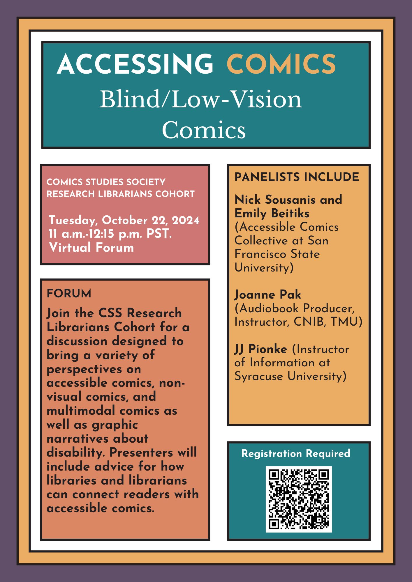 The Research Librarians Cohort of the Comics Studies Society is hosting a virtual forum session titled "Accessing Comics - Blind/Low Vision Comics" on October 22, 2024 at 11am PST.
