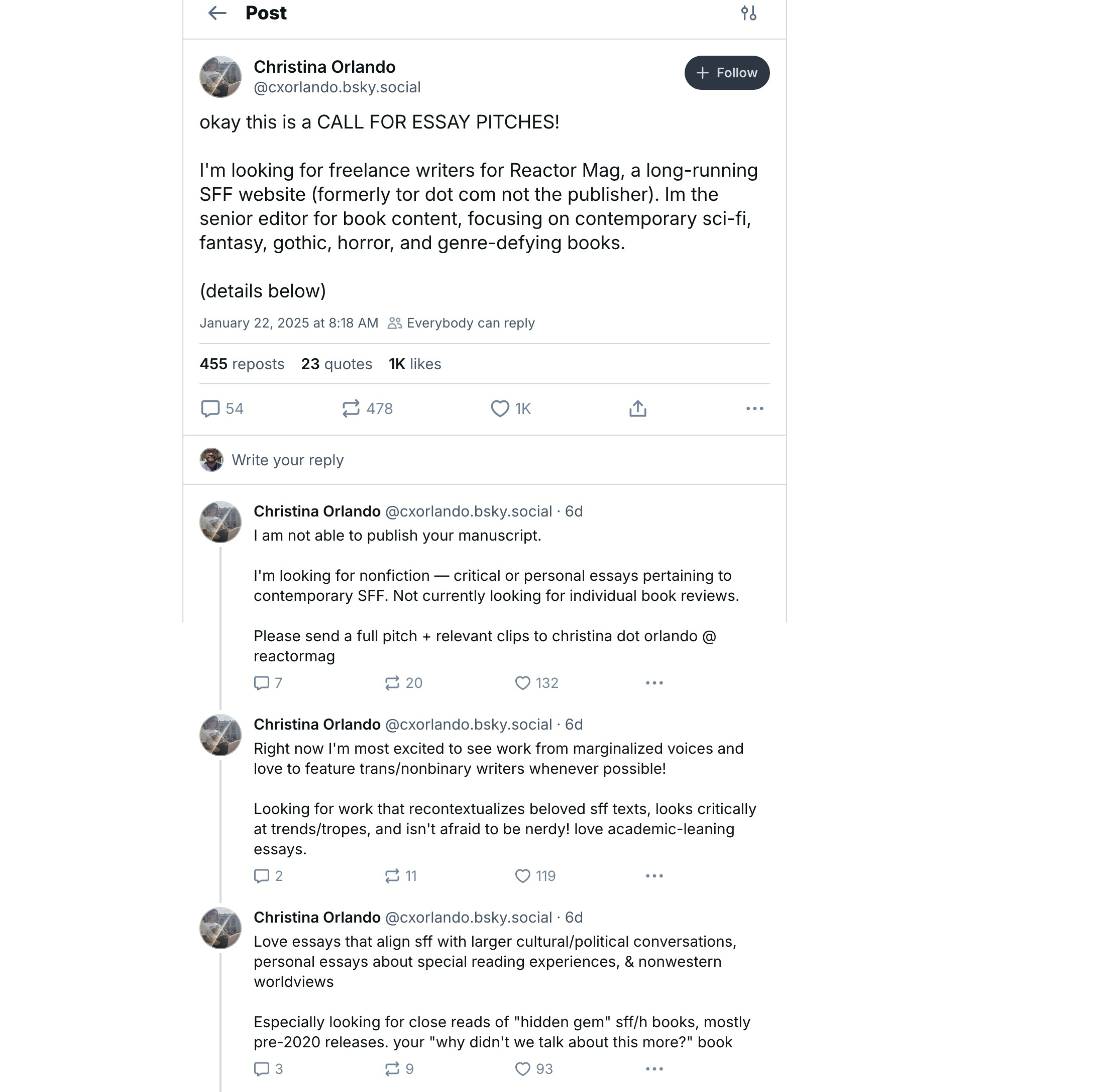 non-academic (paid) essay pitches for Reactor Mag <https://reactormag.com/>,