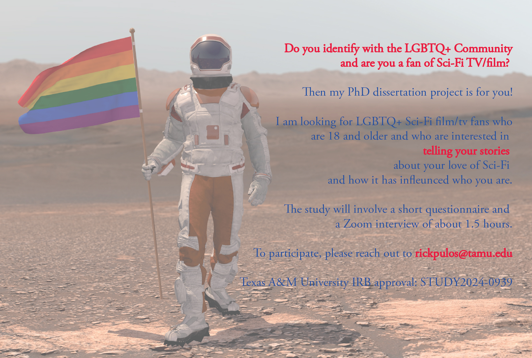 Passing this along in case any LGBTQ+ science fiction fans want to help a TAMU grad student with their Ph.D. dissertation! See forwarded email and feel free to contact the researcher directly.