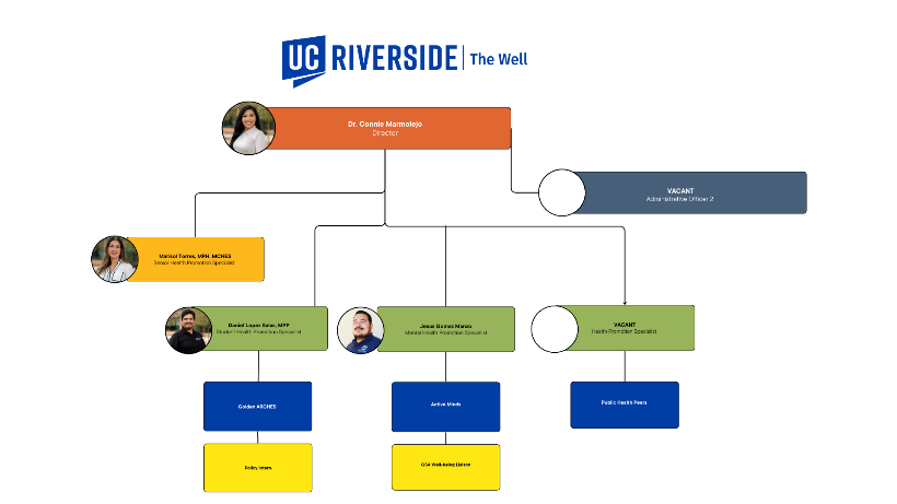 Similarly, we are happy to welcome Jesus Gomez Manzo The Well's new Mental Health Promotion Specialist. In this role, Jesus will play a leadership role in planning, developing, implementing, evaluating, and reporting on multifaceted, campus-wide mental health education and promotion efforts as part of The Well and the UCR's Health Well-being and Safety Organization. This includes large initiatives such as Mental Health Allies. In this role, Jesus will work closely with several HWS departments, including CAPS, Case Management, and SWIFT. He supervises the peer group Active Minds and The Well's Graduate Well-being Liaison. Jesus reports to The Well's Director, Dr. Marmolejo.