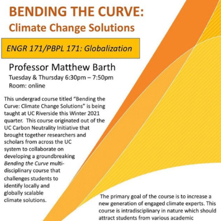 A UCR Undergraduate and Extension course taught by Professor Matthew Barth. Learn about climate change science, impacts, and possible solutions in this Winter 2021 quarter class. Registration is open until Jan. 19th.