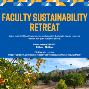 All UCR Faculty interested in sustainability are welcome to attend this virtual retreat. Discussion topics include OASIS, RPU Grants, and general curriculum revision. Register with the zoom link before the event.