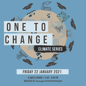 ONE TO CHANGE: CLIMATE SERIES<https://docs.google.com/forms/d/e/1FAIpQLScCGIFNJk_guzbei0nDG-A5PODSwlV1bepITE-16nB6excKqw/viewform>