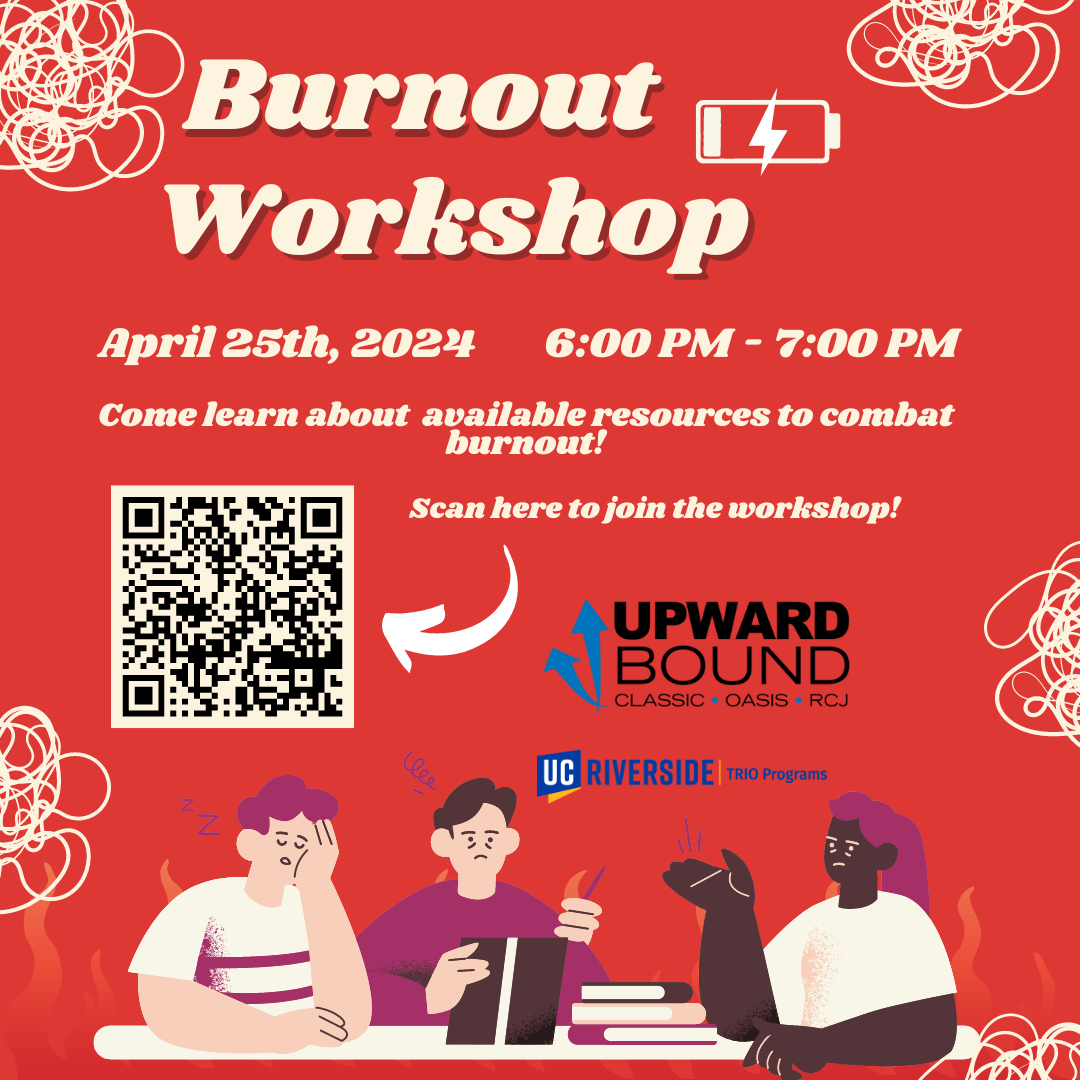 I would like to invite you to our burnout presentation this Thursday April 25th from 6-7pm via zoom. Please come join us and learn about burnout, how to manage it along with a fun activity. Scan the QR code or click on the link below to join us for the workshop this Thursday at 6:00 pm. If you have any questions don't hesitate to reach out to the UB staff.