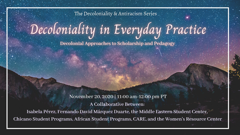 We invite you to join the first event of the Decoloniality and Antiracism Series, entitled, Decoloniality in Everyday Practice: Decolonial Approaches to Scholarship and Pedagogy. This series is a collaborative between Isabela Pérez (GSA DIAL), Fernando David Márquez Duarte, the Middle Eastern Student Center, Chicano Student Programs, African Student Programs, CARE, and the Women's Resource Center. In this workshop, you will learn about the processes of integrating decolonial perspectives as a student in your scholarship and pedagogy, to create a more inclusive and intercultural society. The event will be taking place on Friday, November 20, 2020, from 11:00 am-12:00 pm PT. To RSVP, please click on the following link: https://ucr.zoom.us/meeting/register/tJMvduqorzwqG9H0sh3dy-s4EAm5tyE9B4Aq