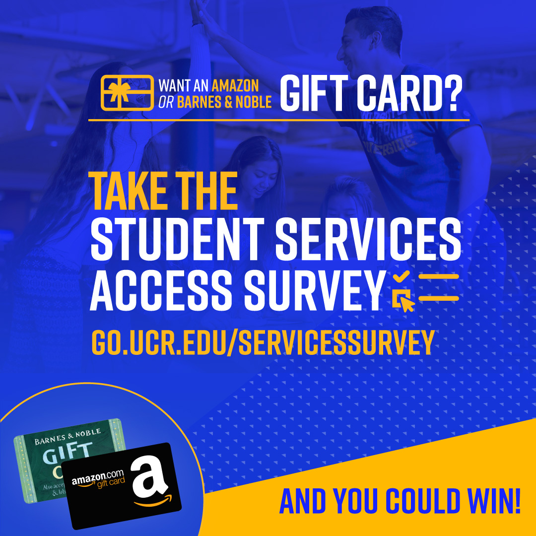 Please take the Student Services Access Survey to share how you've interacted with important campus services and resources during the campus closure and how you'd prefer to interact with those services and resources once the campus reopens. Complete the survey by June 16 and you'll be entered to win one of four $50 Amazon gift cards or one of four $25 Barnes & Noble gift cards. Visit go.ucr.edu/servicessurvey<http://go.ucr.edu/servicessurvey> to take the survey today!